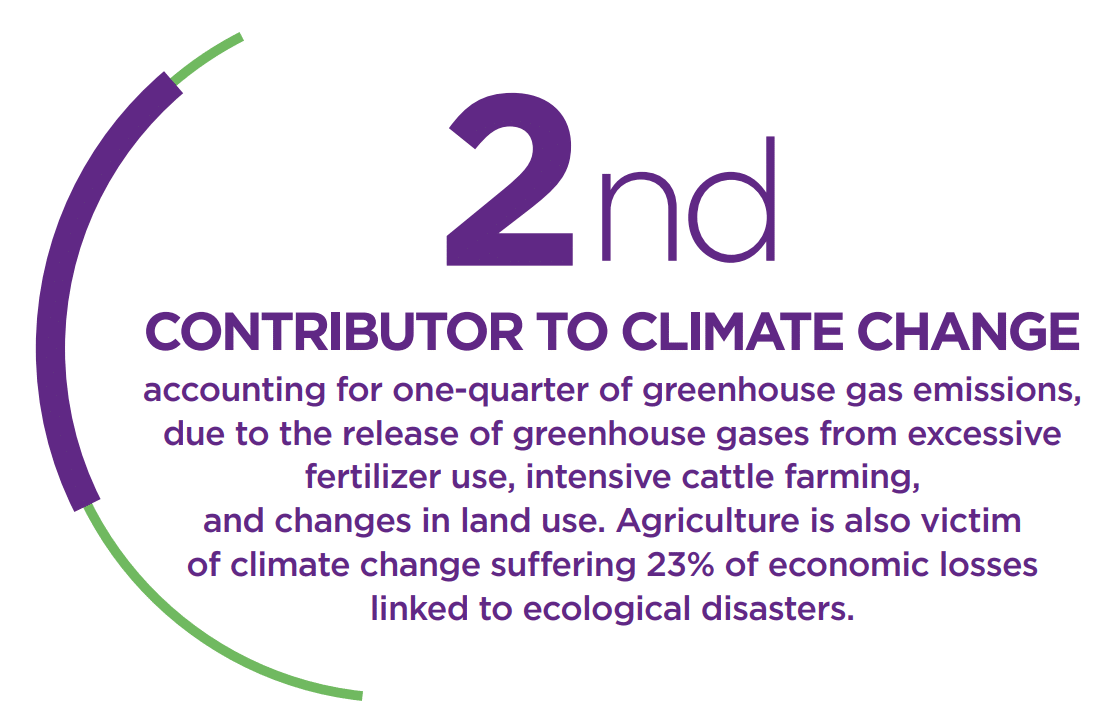 2nd contributor to climate change, accounting for one-quarter of greenhouse gas emissions, due to the release of greenhouse gases from excessive fertilizer use, intensive cattle farming, and changes in land use.